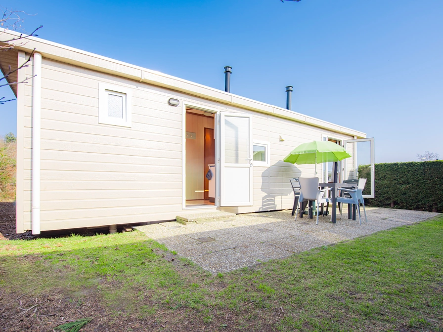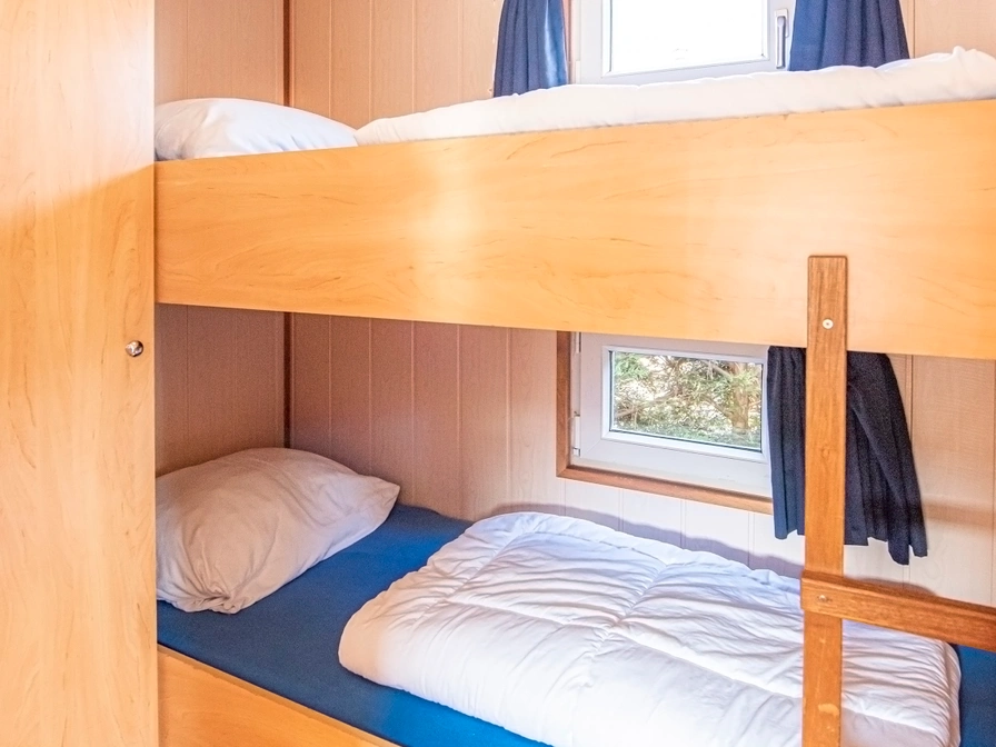 Der 30 m² große Chalet-Wohnwagen ist doppelwandig und gut isoliert. Die Chalets liegen rund um ein großes Spielfeld auf der Dünenseite des Campingplatzes. Es gibt eine Gasheizung, Digitalfernsehen und WLAN. Ein kleiner Campingplatz am Halfweg, geeignet für Familien und Paare. Die Felder sind von Bäumen gesäumt. Vinyl-Wohnzimmer mit 2-Sitzer-Sofa und 2 Stühlen. Esstisch mit 4 Stühlen, Küchenecke mit 4-Flammen-Kochfeld, Kühlschrank, Dunstabzugshaube, Filterkaffeemaschine und Mikrowelle. Badezimmer mit Dusche, Toilette und Waschbecken. Es gibt zwei Schlafzimmer, ein Schlafzimmer mit 1 x Doppelbett (140 x 200) mit 2 x Einzelbettdecken und ein Schlafzimmer mit 1 x Etagenbett (2 x 80-200). Kindermöbel, wie ein Hochstuhl, ein Bettgitter oder ein Campingbett, können kostenlos angefordert werden. Terrasse mit Tisch mit 4 Stühlen und Sonnenschirm. Das Mittelfeld wird als Spielraum freigehalten.