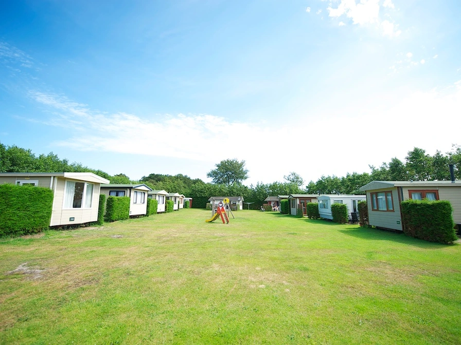 Der 30 m² große Chalet-Wohnwagen ist doppelwandig und gut isoliert. Die Chalets liegen rund um ein großes Spielfeld auf der Dünenseite des Campingplatzes. Es gibt eine Gasheizung, Digitalfernsehen und WLAN. Ein kleiner Campingplatz am Halfweg, geeignet für Familien und Paare. Die Felder sind von Bäumen gesäumt. Vinyl-Wohnzimmer mit 2-Sitzer-Sofa und 2 Stühlen. Esstisch mit 4 Stühlen, Küchenecke mit 4-Flammen-Kochfeld, Kühlschrank, Dunstabzugshaube, Filterkaffeemaschine und Mikrowelle. Badezimmer mit Dusche, Toilette und Waschbecken. Es gibt zwei Schlafzimmer, ein Schlafzimmer mit 1 x Doppelbett (140 x 200) mit 2 x Einzelbettdecken und ein Schlafzimmer mit 1 x Etagenbett (2 x 80-200). Kindermöbel, wie ein Hochstuhl, ein Bettgitter oder ein Campingbett, können kostenlos angefordert werden. Terrasse mit Tisch mit 4 Stühlen und Sonnenschirm. Das Mittelfeld wird als Spielraum freigehalten.