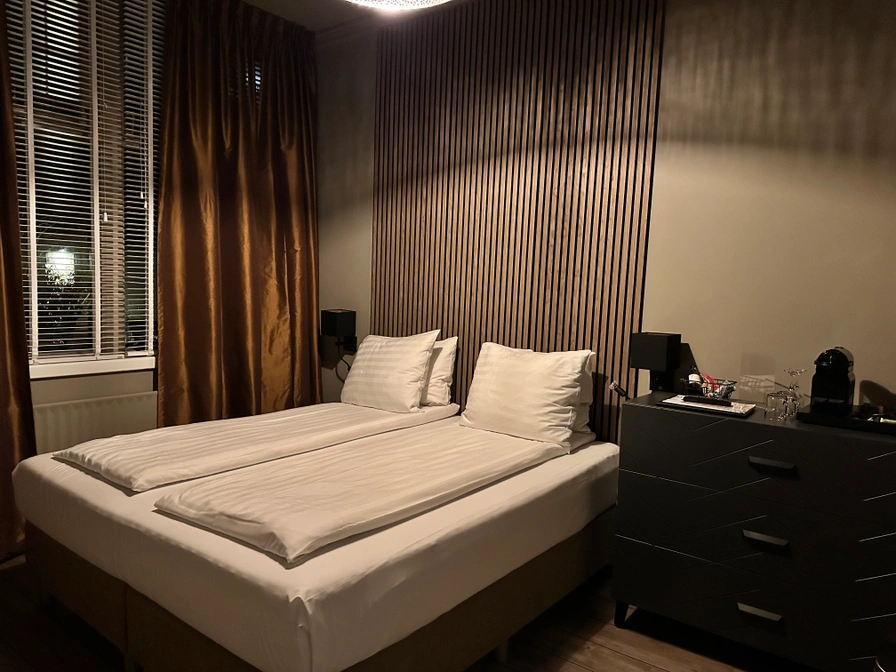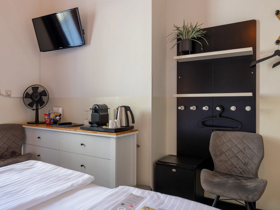 Ein geschmackvoll und komfortabel eingerichtetes Doppelzimmer im Erdgeschoss. Die Lage dieses Zimmers ist nach Norden ausgerichtet. Die Möblierung besteht aus 2 Einzelbetten (90x200) oder 1 Doppelbett (180x200 cm) Flachbildfernseher, Kühlschrank, Wasserkocher und Nespresso-Maschine gehören zur Standardausstattung. Die Badezimmer sind ausgestattet mit: Dusche, WC, Toilettenartikeln und einem Haartrockner. Auf dem Parkplatz neben dem Hotel gibt es Ladestationen für (gemietete) Elektrofahrräder.