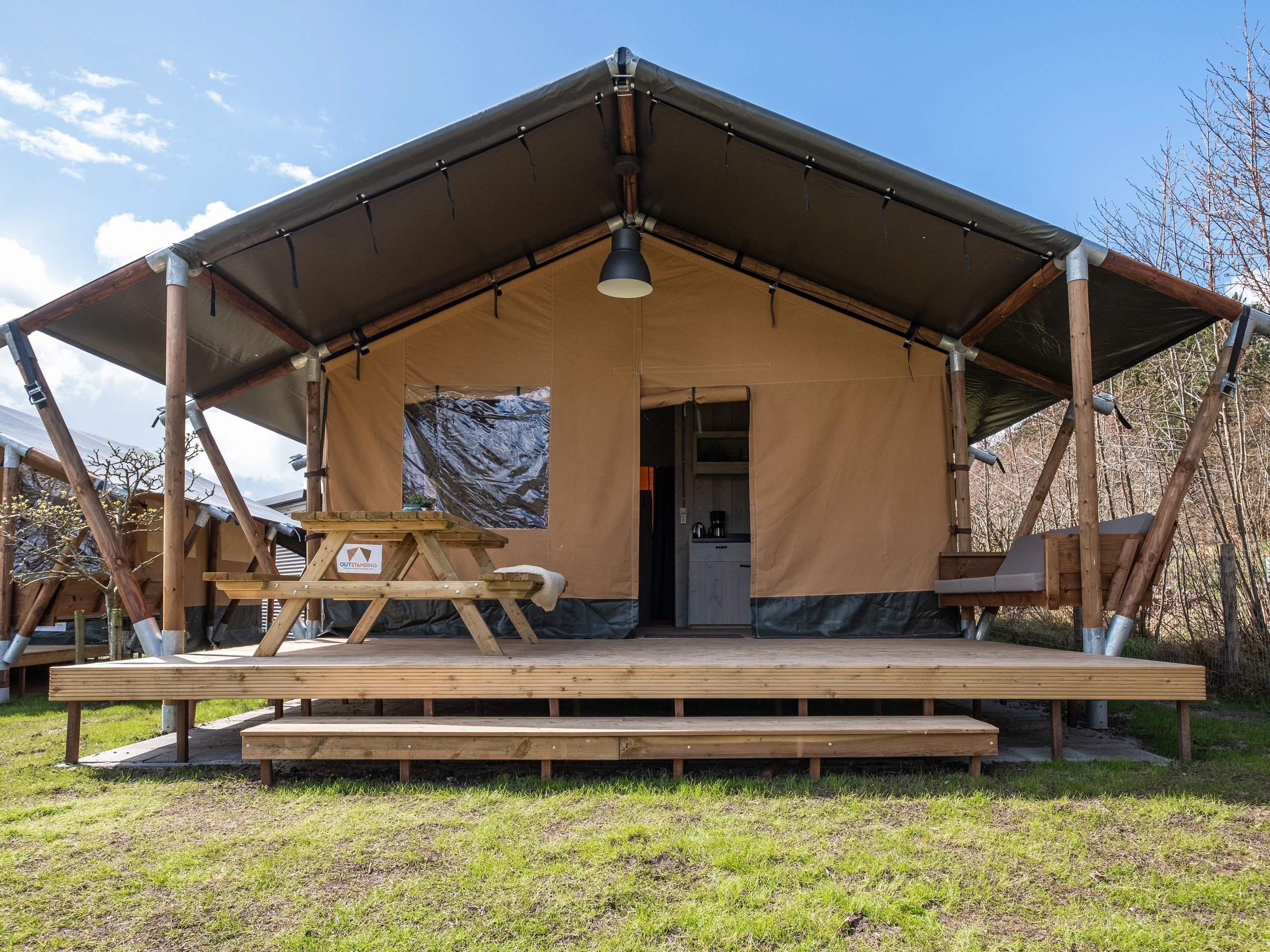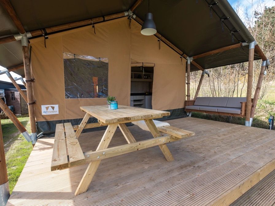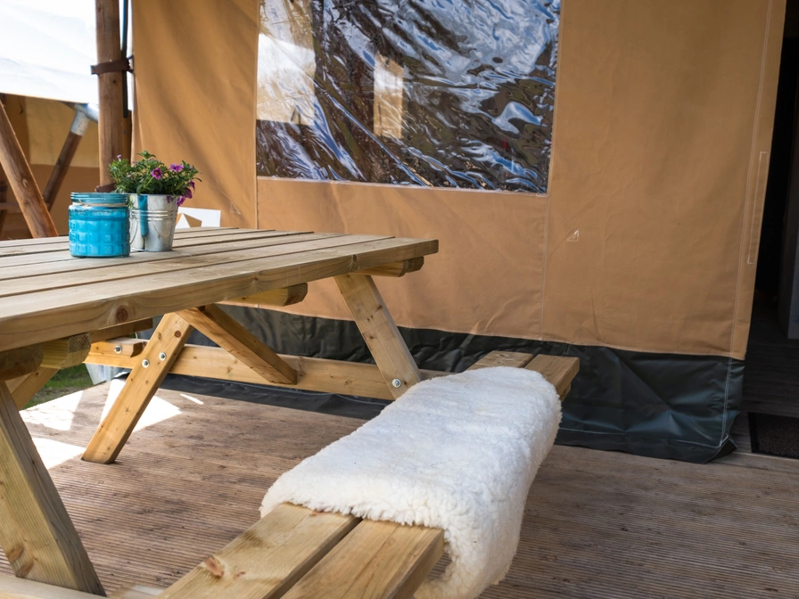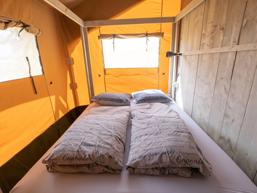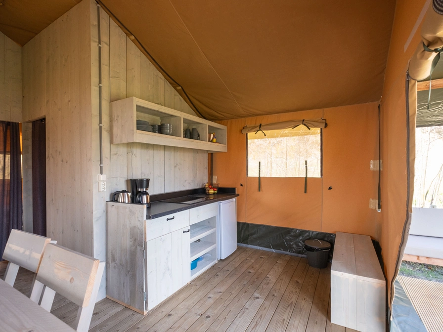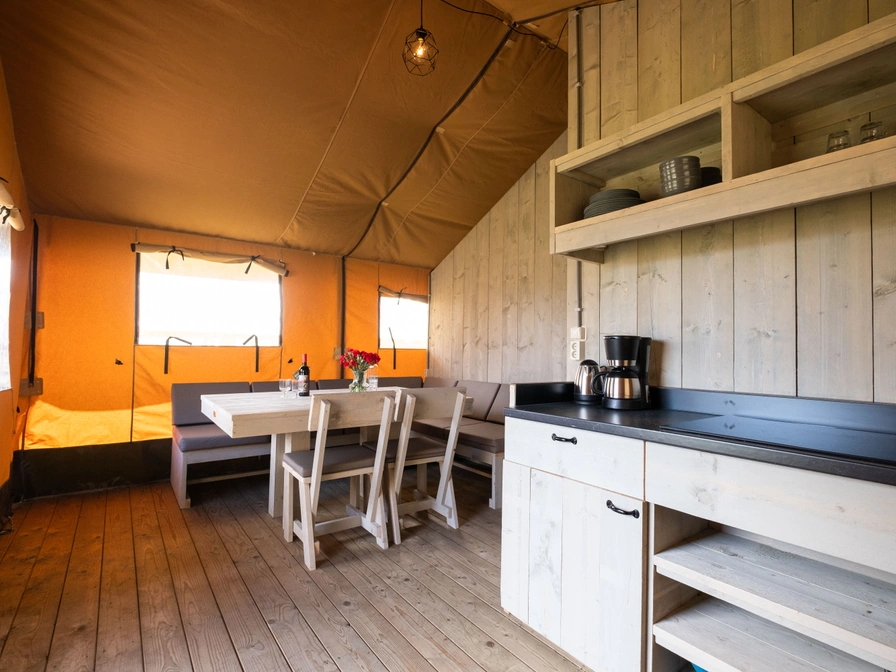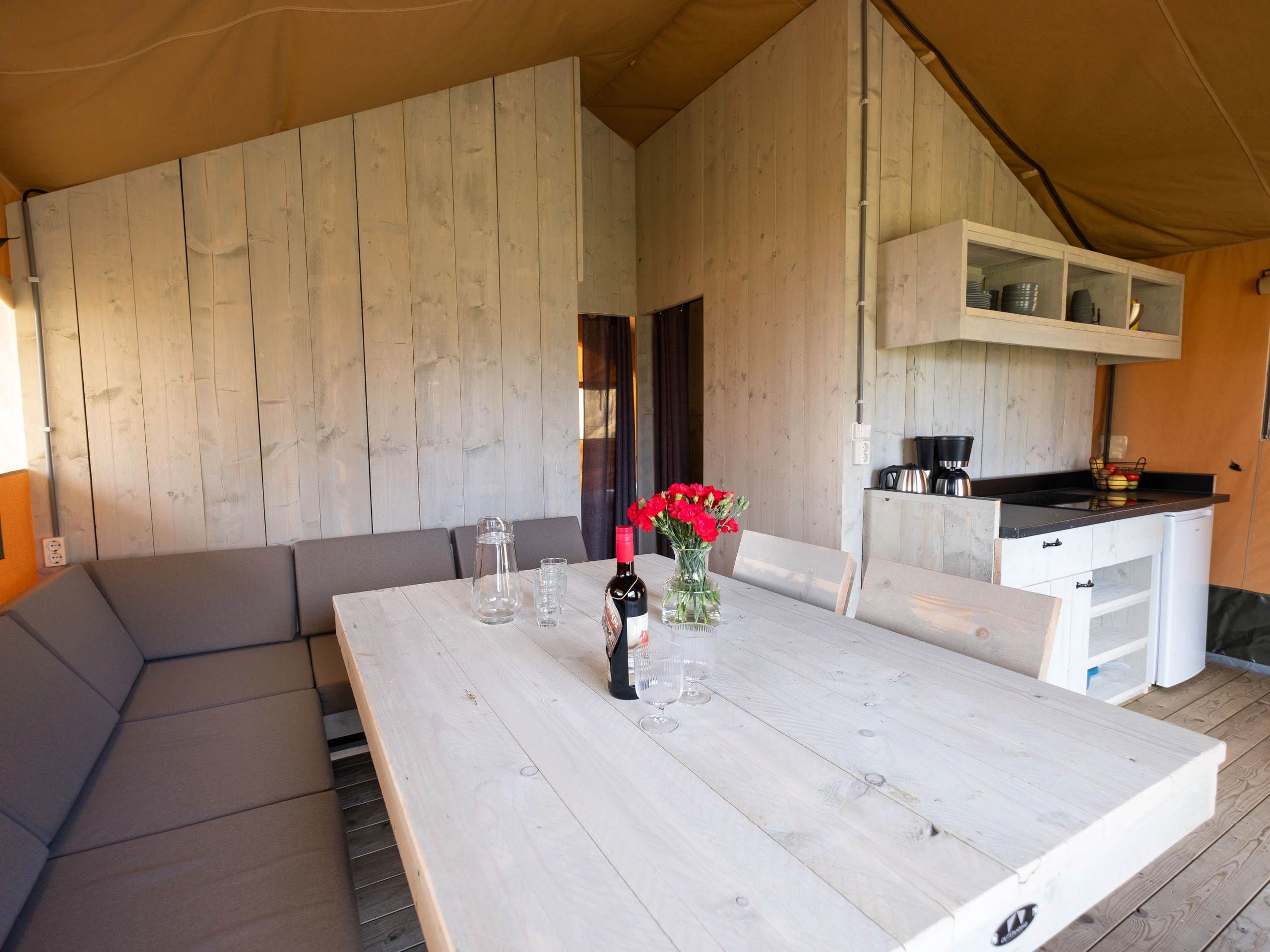 Das geräumige Zelt verfügt über drei Schlafkabinen: eine mit einem Doppelhimmelbett, eine Kabine mit zwei Einzelbetten (die auch nebeneinander gestellt werden können) und eine Kabine mit einem extragroßen Etagenbett. Durch die großzügige Bauweise findet ein Babybett problemlos Platz. Die Betten sind bezogen. Im Vorzelt finden Sie eine gemütliche Sitz- und Essecke sowie eine geräumige Küche mit Sitzbank. Die Küche ist komplett ausgestattet mit einem Elektroherd mit vier Kochstellen und einem Kühlschrank (ohne Gefrierfach). In der Küche gibt es kein fließendes Wasser. Zum Abwaschen und für fließendes Warm- und Kaltwasser können Sie unter die Veranda des Sanitärgebäudes gehen. Dieser ist keine fünfzig Meter entfernt.
